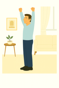 Die Kombination aus sanftem Dehnen mit einem bewussten Lächeln aktiviert Körper und Geist und hebt die Stimmung.
