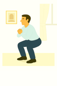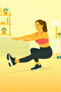 Seitschritte in Hockposition aktivieren Beine und Gesäß bei gleichzeitigem Gleichgewichtstraining. Dies fördert Beweglichkeit und Stabilität im Alltag.